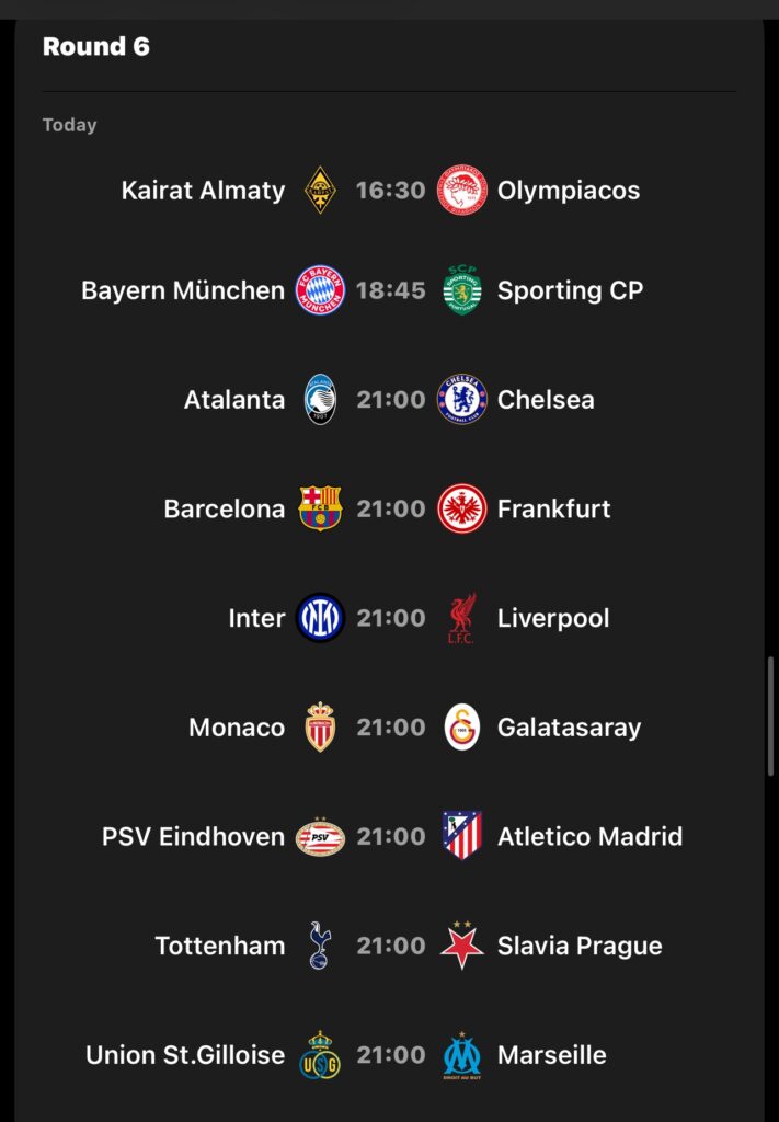 Përveç duelit kryesor, Bayern pret Sportingun, Barcelona luan ndaj Eintracht Frankfurtit, ndërsa Chelsea përballet me Atalantan në Bergamo. PSV–Atletico Madrid, Monaco–Galatasaray, Tottenham–Slavia Prague dhe Royale Union SG–Marseille plotësojnë programin e mbrëmjes.