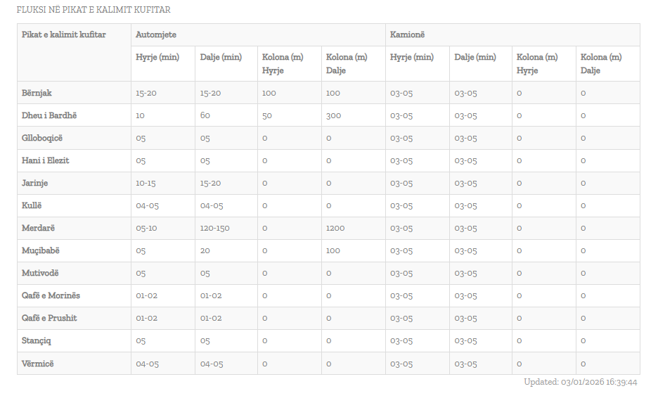 Situata më e ngarkuar paraqitet në Merdarë, ku kolonat e automjeteve arrijnë deri në 1,200 metra dhe pritjet për dalje nga vendi variojnë nga 120 deri në 150 minuta. Në pikëkalimin Dheu i Bardhë, pritjet kanë arritur deri në 60 minuta, me një kolonë prej rreth 300 metrash. Ndërsa në Jarinjë dhe Bërnjak pritjet llogariten nga 15 deri në 20 minuta.