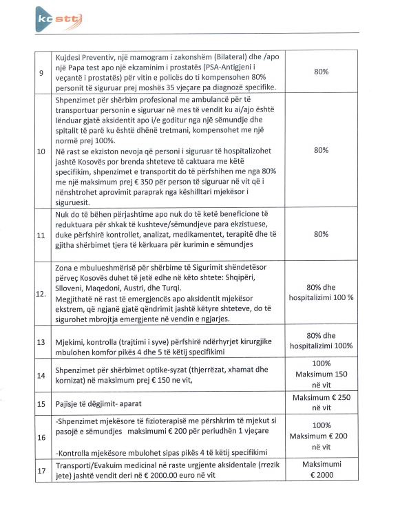 Nga ky sigurim do të përfitojnë 364 punonjës të KOSTT-it, të cilëve do t’u mbulohet në mënyrë të plotë sigurimi shëndetësor dhe ai aksidental. Përfitimet përfshijnë: