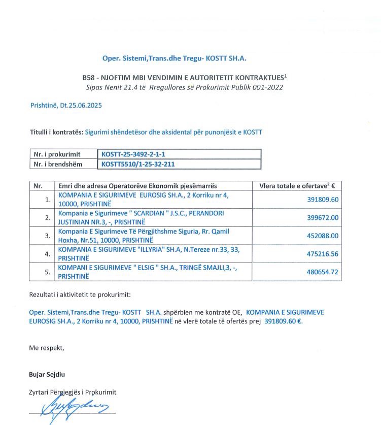Operatori i Sistemit, Transmisionit dhe Tregut (KOSTT) ka ndarë afro 400 mijë euro për sigurimin shëndetësor dhe aksidental të punonjësve të saj. Kontrata është nënshkruar me kompaninë e sigurimeve “Eurosig”, pas përfundimit të procedurave të tenderimit ku kishin konkurruar pesë kompani, dhe është përzgjedhur oferta më e favorshme.