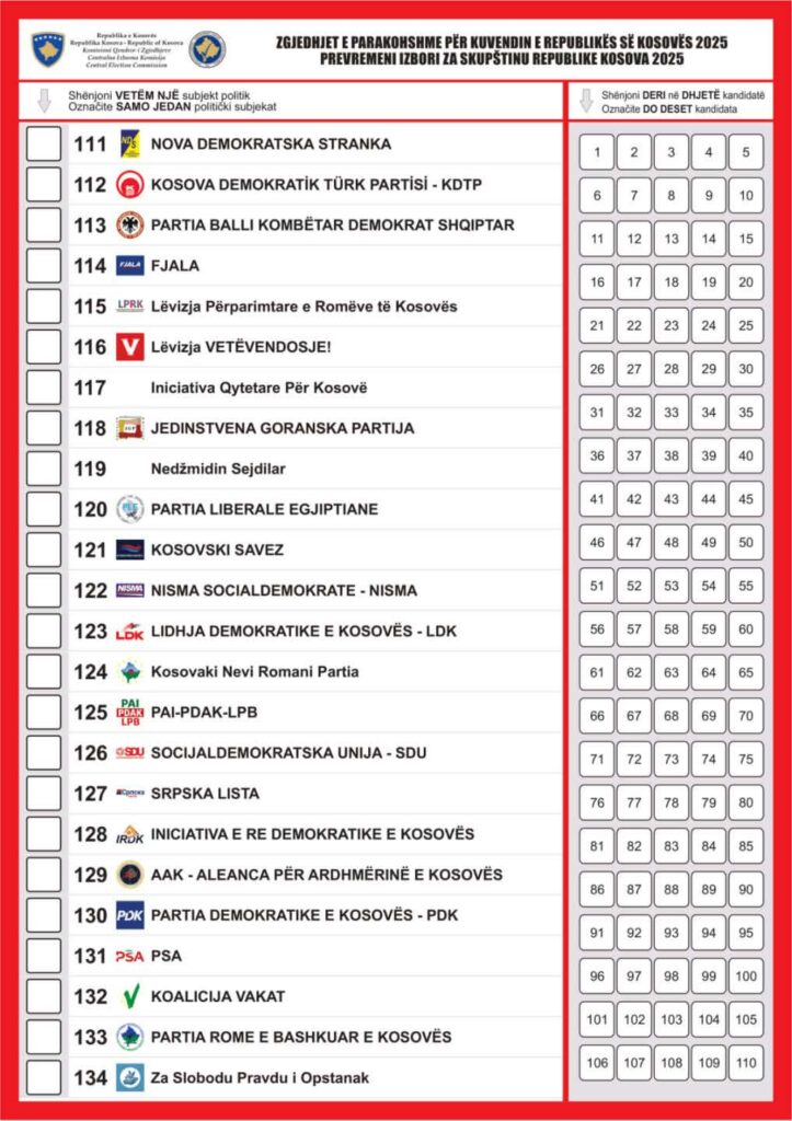 Komisioni Qendror i Zgjedhjeve (KQZ) ka miratuar dizajnin dhe përmbajtjen e fletëvotimit që do të përdoret në vendvotimet brenda Kosovës për zgjedhjet e parakohshme për Kuvendin e Republikës, të cilat do të mbahen më 28 dhjetor 2025.