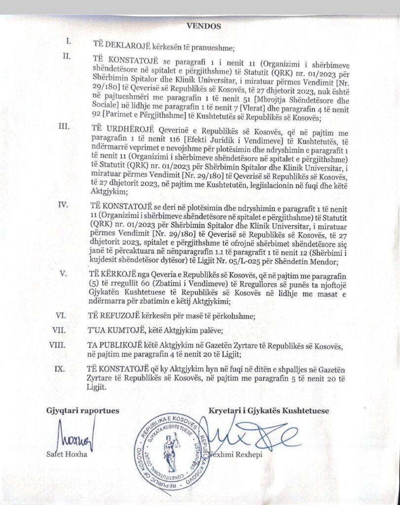 Gjykata Kushtetuese ka shpallur aktgjykimin për rastin KO 141/24, duke konstatuar se një nen i Statutit nr.01/2023 të Shërbimit Spitalor dhe Klinik Universitar të Kosovës nuk është në përputhje me Kushtetutën. Bëhet fjalë për paragrafin 1 të nenit 11, i cili përjashtonte kujdesin mendor nga lista e shërbimeve në spitalet e përgjithshme.