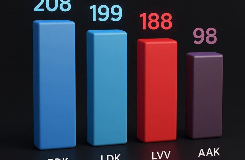 Eugen Cakolli nga KDI ka bërë të ditur se deri më tani Partia Demokratike e Kosovës (PDK) prin me 208 asamblistë, e pasuar nga Lidhja Demokratike e Kosovës (LDK) me 199, Lëvizja Vetëvendosje (LVV) me 188 dhe Aleanca për Ardhmërinë e Kosovës (AAK) me 98 asamblistë.