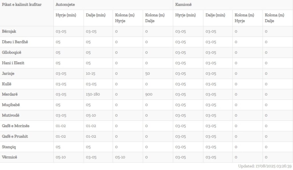 Në pikën kufitare të Merdares vazhdojnë pritjet e gjata për qytetarët që dalin nga Kosova. Sipas të dhënave të fundit, koha e pritjes arrin nga 150 deri në 180 minuta, ndërsa kolona ka shkuar deri në 900 metra. Në hyrje, lëvizja është më e lehtë, me pritje prej vetëm 3 deri në 5 minuta.