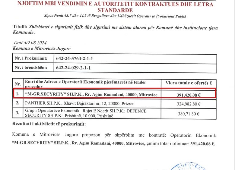 Tenderi kishte konkurruar nga tre kompani, ku M-GR Security ofroi çmimin më të lartë, 391,420 euro, ndërsa ofertat më të ulëta ishin 380,000 dhe 324,000 euro. Komuna shpalli dy kompanitë tjera të papërgjegjshme, duke i refuzuar për mosplotësim të kritereve të tenderit. Si pasojë, fituesi mori rreth 66,445 euro më shumë se oferta më e ulët.