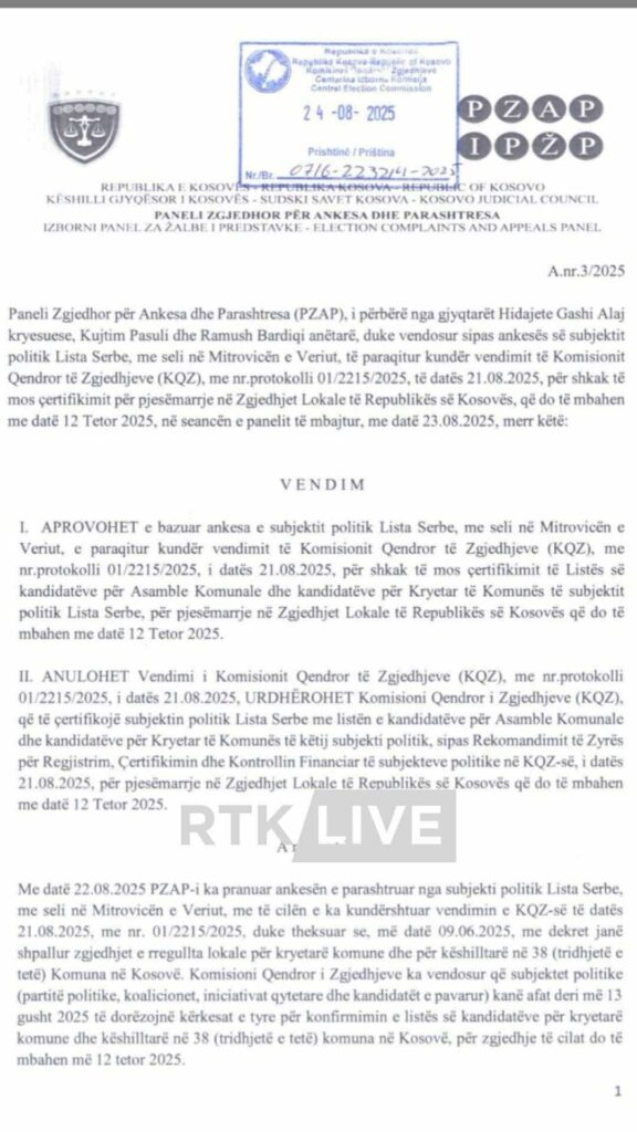 Paneli Zgjedhor për Ankesa dhe Parashtresa (PZAP) ka vendosur në favor të Listës Serbe, duke aprovuar ankesën e këtij subjekti kundër vendimit të Komisionit Qendror të Zgjedhjeve (KQZ) për moscertifikimin e listës së kandidatëve të saj për zgjedhjet lokale të 12 tetorit 2025.