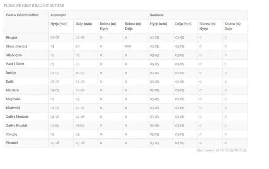 Sipas të dhënave të Qendrës Kombëtare për Menaxhim Kufitar, të përditësuara në ora 08:06, në pikën kufitare të Merdarës dhe tek Dheu i Bardhë koha e pritjes arrin deri në 90 minuta.