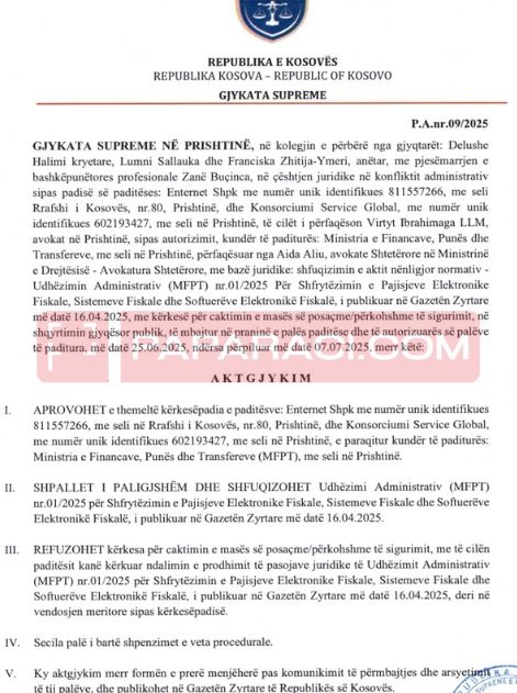 “Aprovohet e themeltë kërkesëpadia e paditësve: Enternet Shpk dhe Konsorciumi Service Global, e paraqitur kundër Ministrisë së Financave, Punës dhe Transfereve.”
