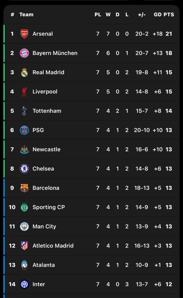 Në pozitat 3 dhe 4 renditen Real Madrid dhe Liverpool me nga 15 pikë, ndërsa Tottenham është e pesta me 14 pikë. PSG, Newcastle United dhe Chelsea ndajnë pozitat gjashtë, shtatë dhe tetë me nga 13 pikë.