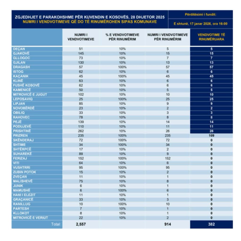 Në Qendrën e Numërimit dhe Rezultateve po vazhdon procesi i rinumërimit të fletëvotimeve, sipas vendimeve të KQZ-së. Deri më sot janë rinumëruar 382 nga 914 vendvotime, duke përfshirë 19 komuna si Deçan, Gjakovë, Gjilan, Dragash, Kaçanik, Prishtinë dhe pjesërisht Prizren.