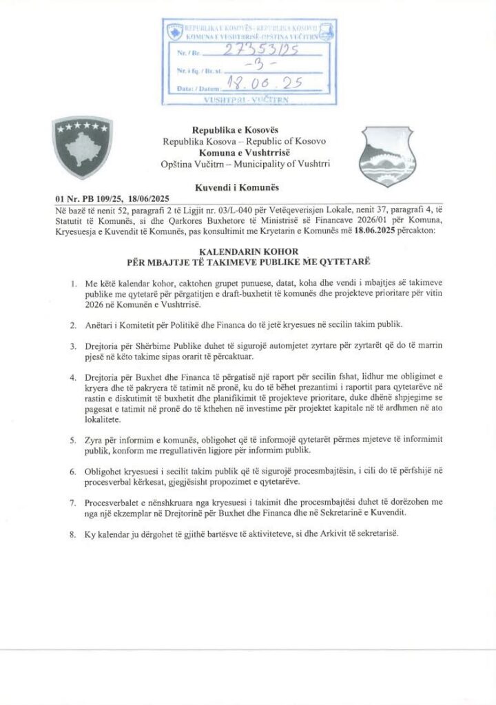 Komuna e Vushtrrisë sot nis zyrtarisht dëgjimet publike me qytetarët, në kuadër të përgatitjeve për draft-buxhetin dhe projektet e planifikuara për vitin 2026.